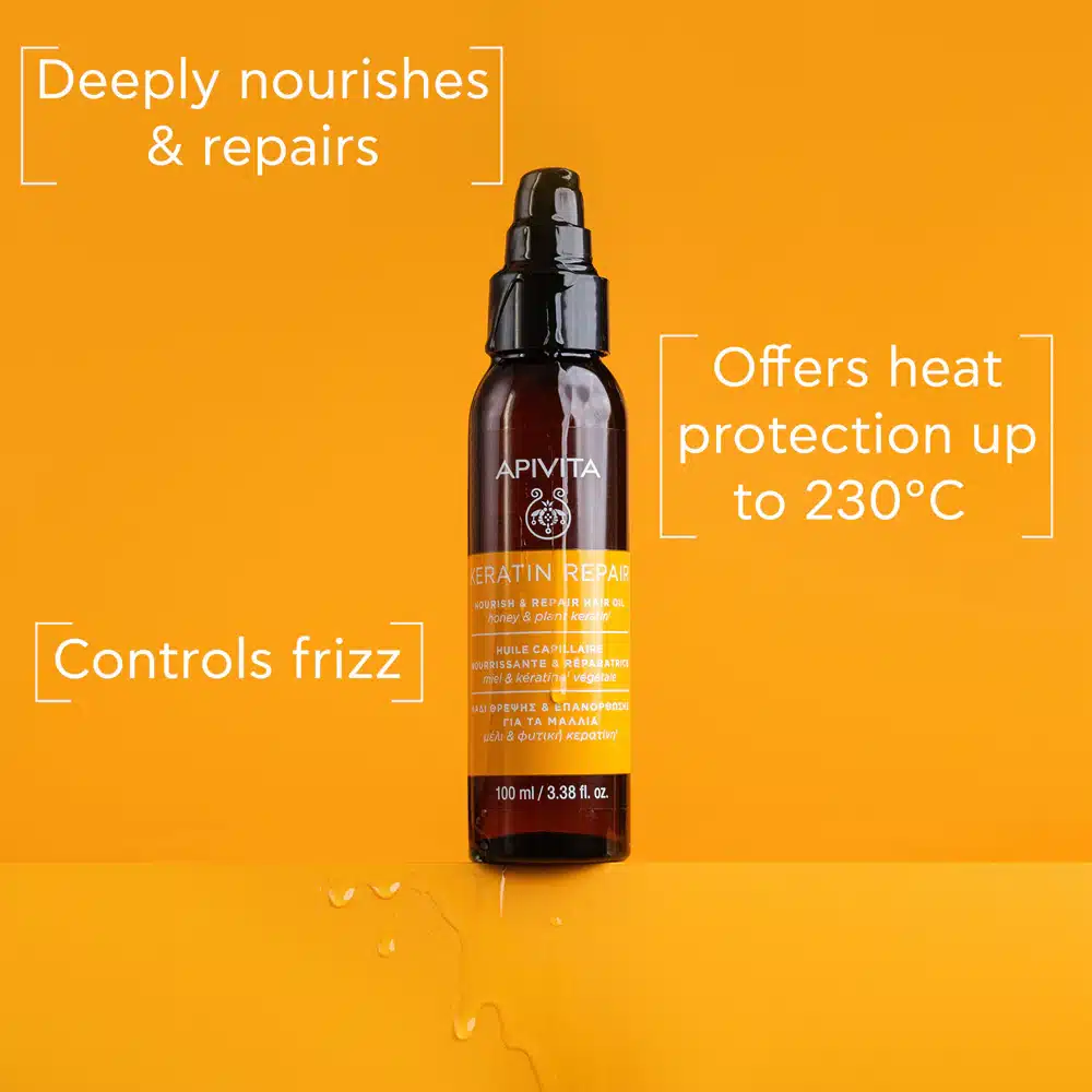 Čini vam se da vaša kosa treba nešto više od same njege koju pruža šampon, regenerator ili maska? Apivita Keratin Repair Nourish Repair Hair Oil klasično ulje za kosu savršeno obogaćuje vašu njegujuću rutinu – pruža kosi posebnu dozu njege, pomaže u obnavljanju njene elastičnosti i opšte fleksibilnosti, potiče njeno obnavljanje i zadnje, ali ne i manje važno zaglađuje njenu strukturu. Rezultat je mekša, glatkija, zdravija i sjajna kosa koja je manje sklona lomljenju.