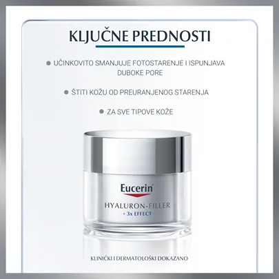 Eucerin Hyaluron-Filler dnevna krema SPF 30 rješava prve znakove starenja suhe kože. Uočljivo popunjava fine linije pa čak i duboke bore za mladolik izgled. Efikasno sprječava fotostarenje izazvano UV zračenjem (prerano starenje kože uzrokovano suncem), produbljivanje bora i štiti kožu od slobodnih radikala.