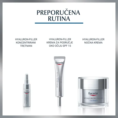 - Za najbolje rezultate, koristite u kombinaciji s Eucerin Hyaluron-Filler koncentratom, Eucerin Hyaluron-Filler kremom za područje oko očiju SPF 15 i Eucerin Hyaluron-Filler noćnom njegom