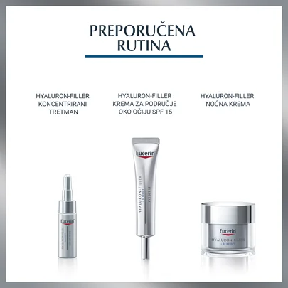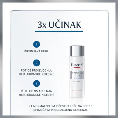 - Eucerin Hyaluron-Filler dnevna krema SPF 15 za normalnu do mješovitu kožu ima jedinstvenu kombinaciju visoko i niskomolekularne hijaluronske kiseline, glicin-saponina i enoksolona koji zaglađuje fine linije pa čak i popunjava duboke bore za mladenački izgled.