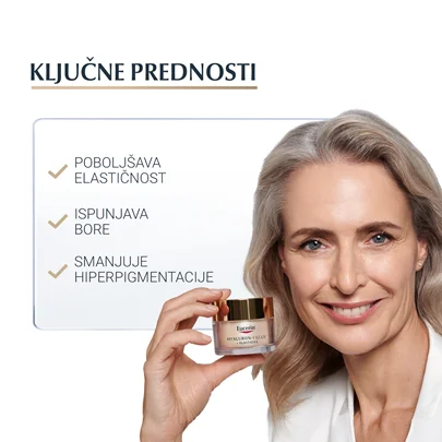 Jedinstvena formula pruža brojne anti-age pogodnosti. Eucerinova inovativna kombinacija visokomolekularne i niskomolekularne hijaluronske kiseline vidljivo ispunjava duboke bore. Arktin (aktivator koji dokazano ubrzava obnovu kolagena u stanicama kože) djeluje zajedno sa silimarinom (moćni antioksidans koji štiti kolagen i elastin od propadanja i poboljšava cirkulaciju na staničnoj razini). Koža postaje čvršća i zaglađenija te svježeg i sjajnog izgleda.
