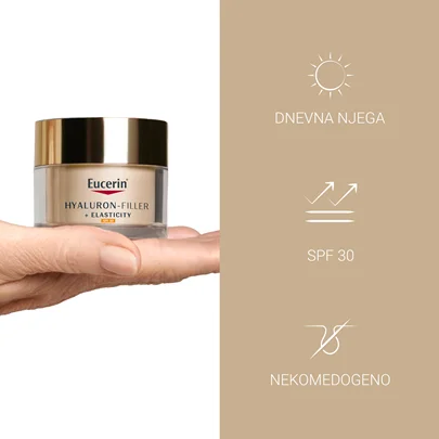 Eucerin Hyaluron-Filler + Elasticity dnevna krema SPF 30 ispunjava duboke bore i poboljšava elastičnost kože.