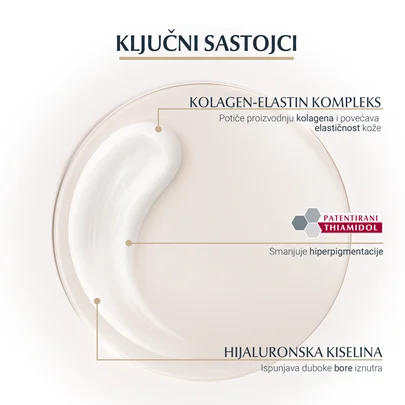 SASTAV: Aqua, Glycerin, Alcohol Denat, C12-15 Alkyl Benzoate, Butyl Methoxydibenzoylmethane, Cetearyl Alcohol, Hydroxypropyl Starch Phosphate, Bis-Ethylhexyloxyphenol Methoxyphenyl Triazine, Behenyl Alcohol, Dibutyl Adipate, Ethylhexyl Triazone, Phenylbenzimidazole Sulfonic Acid, Tapioca Starch, Diethylamino Hydroxybenzoyl Hexyl Benzoate, Sodium Hyaluronate, Arctium Lappa Fruit Extract, Creatine, 1-Methylhydantoin-2-Imide, Isobutylamido Thiazolyl Resorcinol, Xanthan Gum, Sodium Chloride, Sodium Stearoyl Glutamate, Glyceryl Stearate, Sodium Hydroxide, Dimethicone, Trisodium EDTA, Ethylhexylglycerin, Phenoxyethanol, Pentaerythrityl Tetra-di-t-butyl Hydroxyhydrocinnamate, Parfum