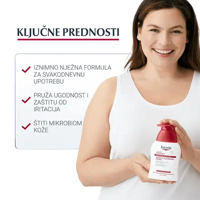 Koža intimnog područja posebno je osjetljiva te narušavanje njene prirodne zaštite može dovesti do podložnosti iritacijama, nelagode pa čak i infekcija. Zato za ovo područje treba koristiti preparat za blago čišćenje s umirujućim svojstvima. Eucerin Fluid za intimnu njegu ima pH vrijednost od 4,5, prilagođenu pH vrijednosti ženskog intimnog područja te sadržava blagi sistem tenzida. Koristite svakodnevno za čišćenje, njegu i olakšanje.