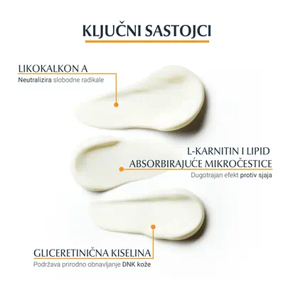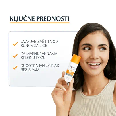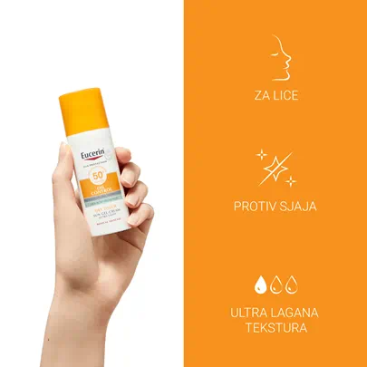 Eucerin Sun Oil Control gel-krema za zaštitu kože lica od sunca SPF 50+ je svakodnevna krema za zaštitu od sunca za lice za masnu kožu i kožu sklonu aknama. Napredna spektralna tehnologija kombinuje širokopojasne i fotostabilne UVA/UVB filtere1 za visoku UV zaštitu s likokalkonom A za neutralizaciju slobodnih radikala uzrokovanih UV i HEVIS svjetlošću. Formula takođe sadrži gliceretiničnu kiselinu, koja podupire vlastiti mehanizam obnove DNK kože. Tehnologija kontrole mašćenja i regulisanje sebuma s L-karnitinom i upijajućim mikro česticama pruža koži trenutačni efekat suh na dodir i dugotrajan efekat protiv sjaja do 12 sati.