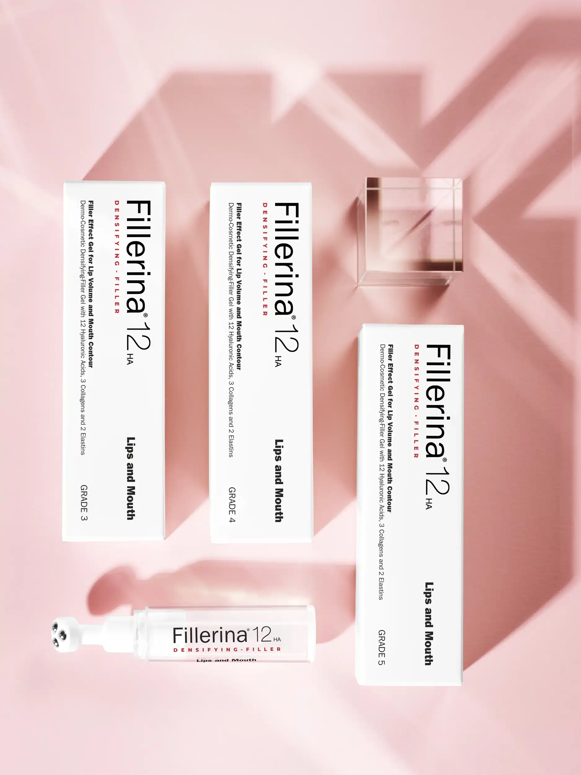 Fillerina 12HA sa efektima popunjavanja i zatezanja za usne i usta je dermokozmetički tretman gelom koji podstiče efekat povećanja volumena i popunjavanja neravnina na tkivu i definiše konture usta zahvaljujući svom dejstvu zaglađivanja bora. Sadrži visoko modulovanu koncentraciju 12 molekula hijaluronske kiseline, dopunjenu sa 3 molekula kolagena i 2 elastina koji imaju različite molekulske težine kako bi konturi usana i usta pružile čvrstinu i fleksibilnost. Pseudoalteromonas Ferment je specifična komponenta koja je naročito efikasna u stimulaciji sinteze kolagena na nivou kože, tako kratkoročno/dugoročno doprinoseći smanjivanju vidljive znakove na konturi usana (testiranje na aktivnim sastojcima).
