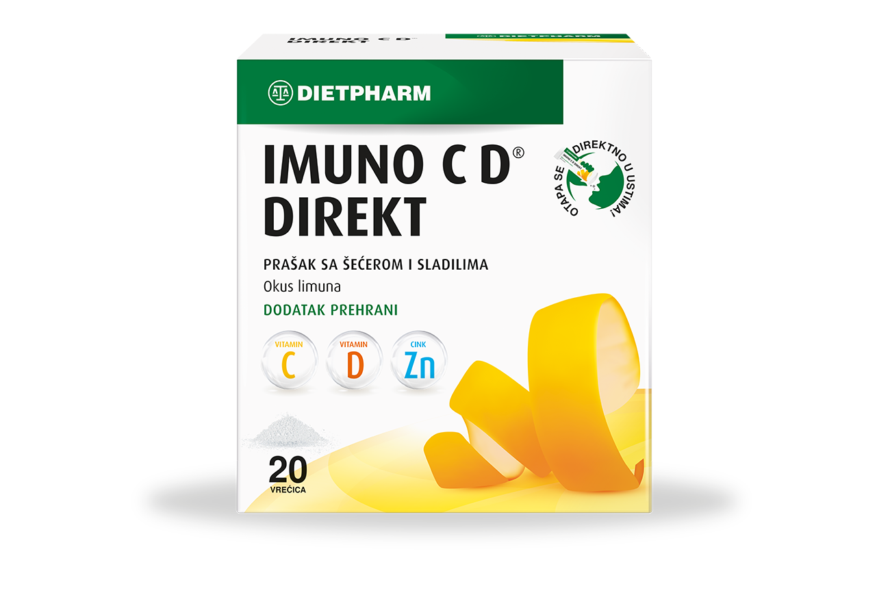 Imuno C D ® direkt prašak namijenjen je osobama koje imaju oslabljen imunitet, osjećaju umor i iscrpljenost. Imuno CD ® je dodatak prehrani s optimalnom kombinacijom sastojaka za potporu imunitetu . Prašak sadrži vitamine C i D te cink u obliku cink citrata koji se dobro apsorbira u organizmu.