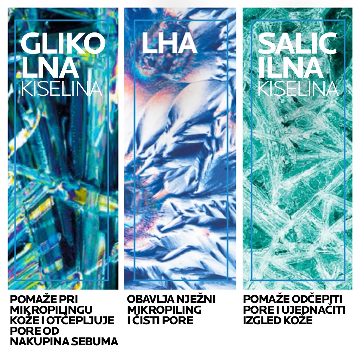 LHA: LHA se odlikuje vrlo dobrim mikropilingom i pritom štiti površinske stanice kože. Omogućava sitno ljuštenje kože i pomaže smanjiti pojavu komedona. Koža je ujednačena, a sitne se linije smanjuju.