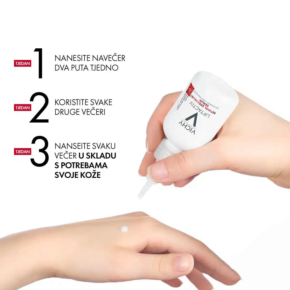 • 3. sedmica. Svako veče nanesite količinu proizvoda u skladu s potrebama svoje kože. U slučaju trajne nelagode produžite razdoblje između primjena i/ili smanjite količinu nanesenog proizvoda.